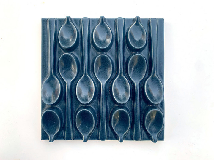 This high-relief tile has an alternating pattern of spoons. The glazes highlight the curves and edges of the tile. The tile is notched for ease of hanging.