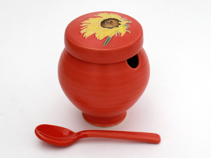 This coral red sugar bowl features a carved lid with a sunflower pattern on the lid. A matching ceramic spoon comes with the jar. It’s perfect for serving and looks lovely on your counter for daily use as well.