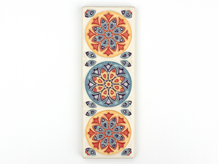 This modern tile design features three intricate circular patterns glazed in shades of blue, orange, red, purple and white. The back of the tile is double notched so the tile can hang horizontally or vertically.